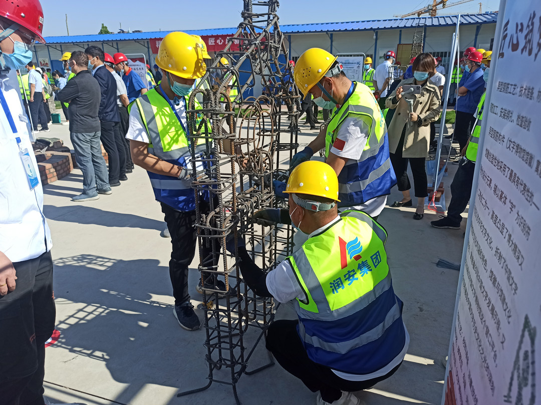 本次技能展示活動(dòng)設(shè)置了鋼筋綁扎和砌筑兩個(gè)項(xiàng)目,我公司派遣八名職工代表參加了本次技能展示,選手們身著統(tǒng)一工作服,以嫻熟的操作技能展現(xiàn)了過(guò)硬的技術(shù)水平。砌筑工速度與質(zhì)量并重,一手拿著泥刀,一手不停地一塊塊砌磚,每一道工序、每一個(gè)細(xì)節(jié)都力求做到完美,最終圓滿完成了砌筑作品《文字博物館》。鋼筋工粗中有細(xì),在大面積作業(yè)的同時(shí),即時(shí)進(jìn)行細(xì)節(jié)處理,確保作品垂直、平整,經(jīng)過(guò)一系列的復(fù)雜操作,一個(gè)完美的安陽(yáng)文字博物館館徽便呈現(xiàn)在眼前。高超的技藝水平贏得了領(lǐng)導(dǎo)和現(xiàn)場(chǎng)觀眾的一致稱贊。