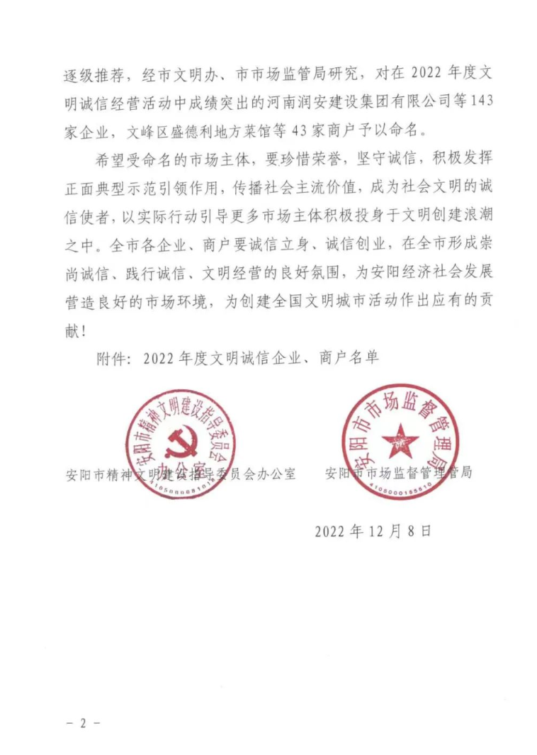 近日,安陽市精神文明建設指導委員會辦公室、安陽市市場監(jiān)督管理局聯合印發(fā)《關于命名2022年度安陽市“文明誠信企業(yè)、文明誠信商戶”的決定》。河南潤安建設集團有限公司、河南潤安建設集團房地產開發(fā)公司雙雙榮登“安陽市2022年度文明誠信企業(yè)”榜單,分別名列榜單第1名和第2名。